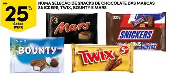 Numa seleção de snacks de chocolate das marcas snickers, twix, bounty e mars em promoção esta semana na Continente Bom dia