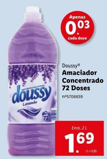 | Doussy Amaciador Concentrado 72 doses | Lidl | 1,35 € | 0,99 € | 0,36 € Desconto | 17 janeiro 2022 | 23 janeiro 2022 | |