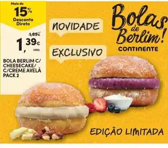 | BOla Berlim C/ Cheesecake C/Creme Avelã Pack 2 | Continente | 1,39 € | 17 agosto 2021 | 24 agosto 2021 | |||