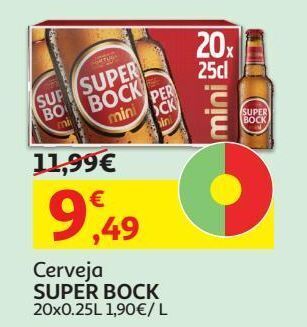| Cerveja super bock 20x0.25 l | Auchan | 11,99 € | 9,49 € | 2,50 € Desconto | 18 janeiro 2023 | 24 janeiro 2023 | |