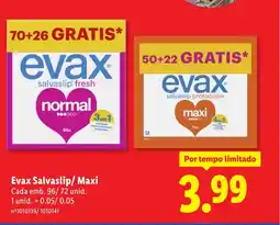 Atualmente existem várias promoções de Evax em vigor, incluindo em Lidl e noutras grandes marcas. Há campanhas como LEVE 2 PAGUE 1, LEVE 3 PAGUE 2 ou -25% em produtos como Evax Salvaslip/Maxi, Pensos higiénicos evax e Pensos Hig. Evax Salvaslip. Use os filtros para selecionar por formato, quantidade ou marca da sua preferência.