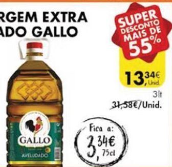 | Azeite Virgem Extra Aveludado Gallo 75cl | Pingo Doce | 8,58 € | 4,39 € | 4,19 € Desconto | 24 maio 2022 | 30 maio 2022 | |