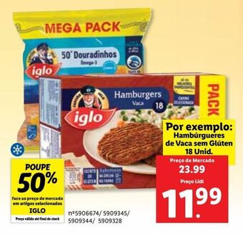 | Hambúrgueresde Vaca sem Glúten Iglo 8 Unid | Lidl | 9,99 € | 4,99 € | 5,00 € Desconto | 17 janeiro 2022 | 23 janeiro 2022 | |