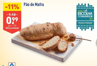 | Pão de Mafra 500g | ALDI | 1,12 € | 0,99 € | 0,13 € Desconto | 24 janeiro 2024 | 30 janeiro 2024 | |