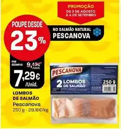 | Pescanova - lombos de salmao | Intermarché | 9,46 € | 7,29 € | 2,17 € Desconto | 03 agosto 2024 | 06 setembro 2024 | |