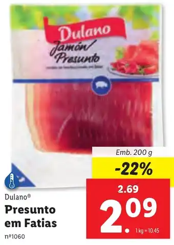 | Dulano Selection Presunto Fatiado | Lidl | 2,79 € | 2,37 € | 0,42 € Desconto | 23 maio 2022 | 29 maio 2022 | |