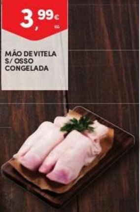 | Mão de Vitela S/Osso Congelada | Continente | 3,99 € | 06 maio 2022 | 09 maio 2022 | |||